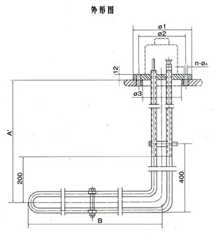 參數尺寸 | 電熱管Φ mm | 電熱管表面負荷 w/cm2 | 功率 kw | 電壓 V | 發熱區尺寸 B′mm | Φ1 | Φ2 | Φ3 | n-Φ4 |